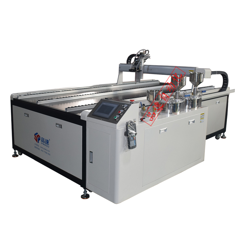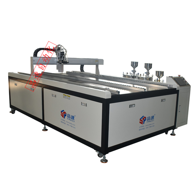 品速科技專業生產的PS-DJ1224全自動水晶?封釉機,有效行程為1200*2400*100mm,采用同步帶運行,重復定位精度±0.05mm,主要用于各種移門,相框,相冊,屏風,背景墻,地板磚等產品表面覆膠.